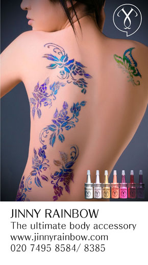 You've seen artists at theme parks and parties create bedazzling designs...Now you can create your own professional body art shimmer that shines bright, day & night! It takes only seconds - Just press on the stencil wherever you want to. Brush on the patented adhesive, dip the brush in the glitter - it takes no time to apply the design - then just go with the glow!